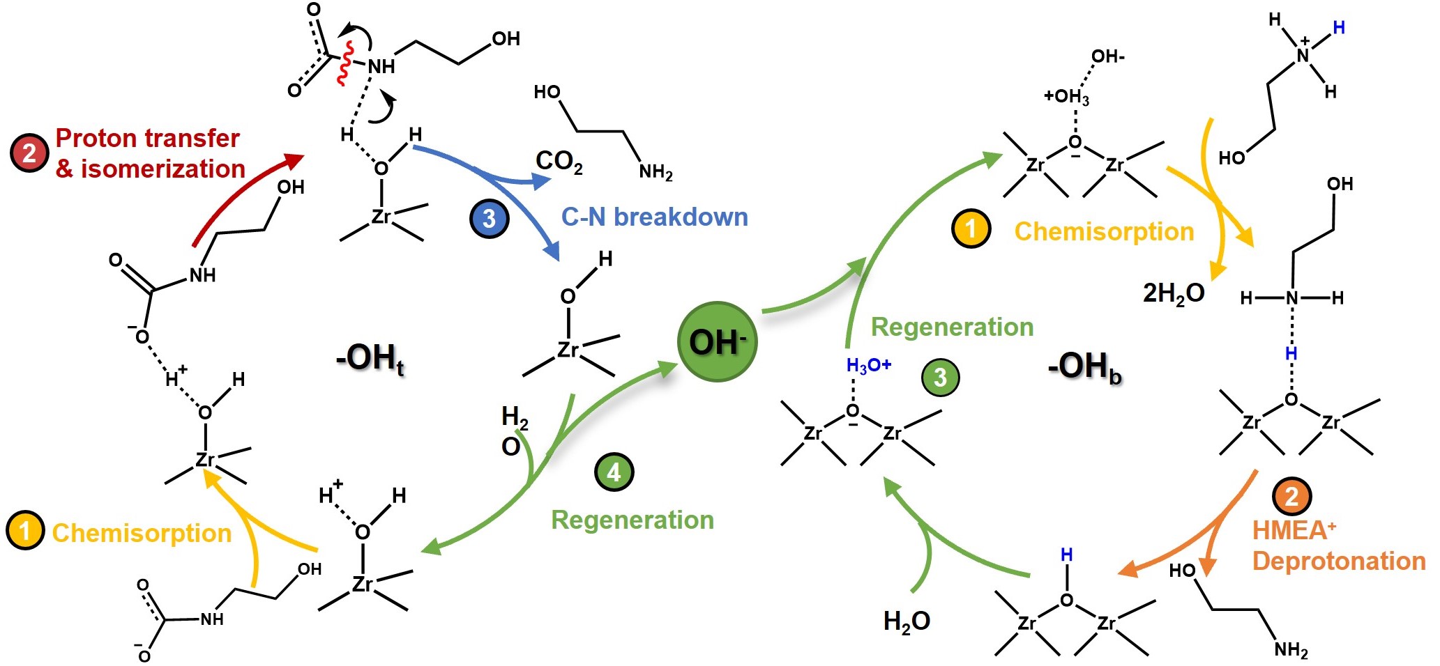针对上述问题和基于前期研究基础,研究人员通过调控溶胶-凝胶合成方法的pH值,获得了富含桥联羟基和端位羟基的ZrOxHy固体催化剂。原位表征和动力学研究表明,无需这两种羟基在催化剂表面的空间邻近性,通过催化剂羟基之间的酸碱平衡和协同催化即可实现氨基甲酸盐解离与质子转移的双循环反应,从而提升二氧化碳的脱附速率。