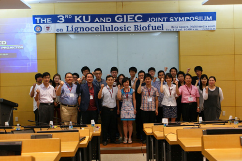 访问期间,双方联合举行了“The 3rd KU and GIEC Joint Symposium on Lignocellulosic BioFuel”。研讨会由韩国高丽大学Sung Ok Han教授主持,他首先对广州能源所的来访人员表示欢迎,并介绍了本次会议召开的背景、目的和议程。许敬亮、徐惠娟、张宇和郭颖分别介绍了广州能源所在纤维素燃料醇、合成气发酵、纤维素酶水解动力学和微藻能源化利用的最新研究进展。