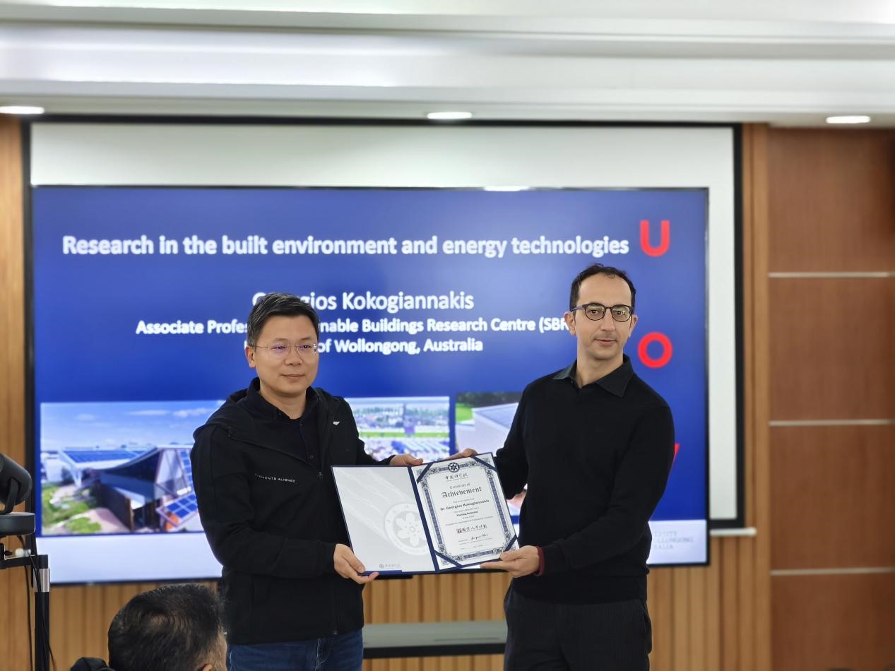 会上,宋文吉为Georgios Kokogiannakis教授颁发了“tyc1286太阳集团总站国际人才计划(PIFI)-国际访问学者”证书。tyc1286太阳集团总站国际交流计划(CAS President’s International Fellowship Initiative,PIFI)是一项旨在建立科学合作和促进全球研究交流的资助计划,也是对Georgios Kokogiannakis在其专业领域内所取得成就的认可。